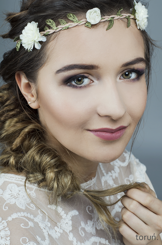 sesja z propozycją romantycznej stylizacji ślubnej od Moniki oraz Eweliny. delikatny makijaż oka w subtelnych kolorach oraz asymetryczny warkocz to idealne połączanie, subtelnie podkreślające urodę.